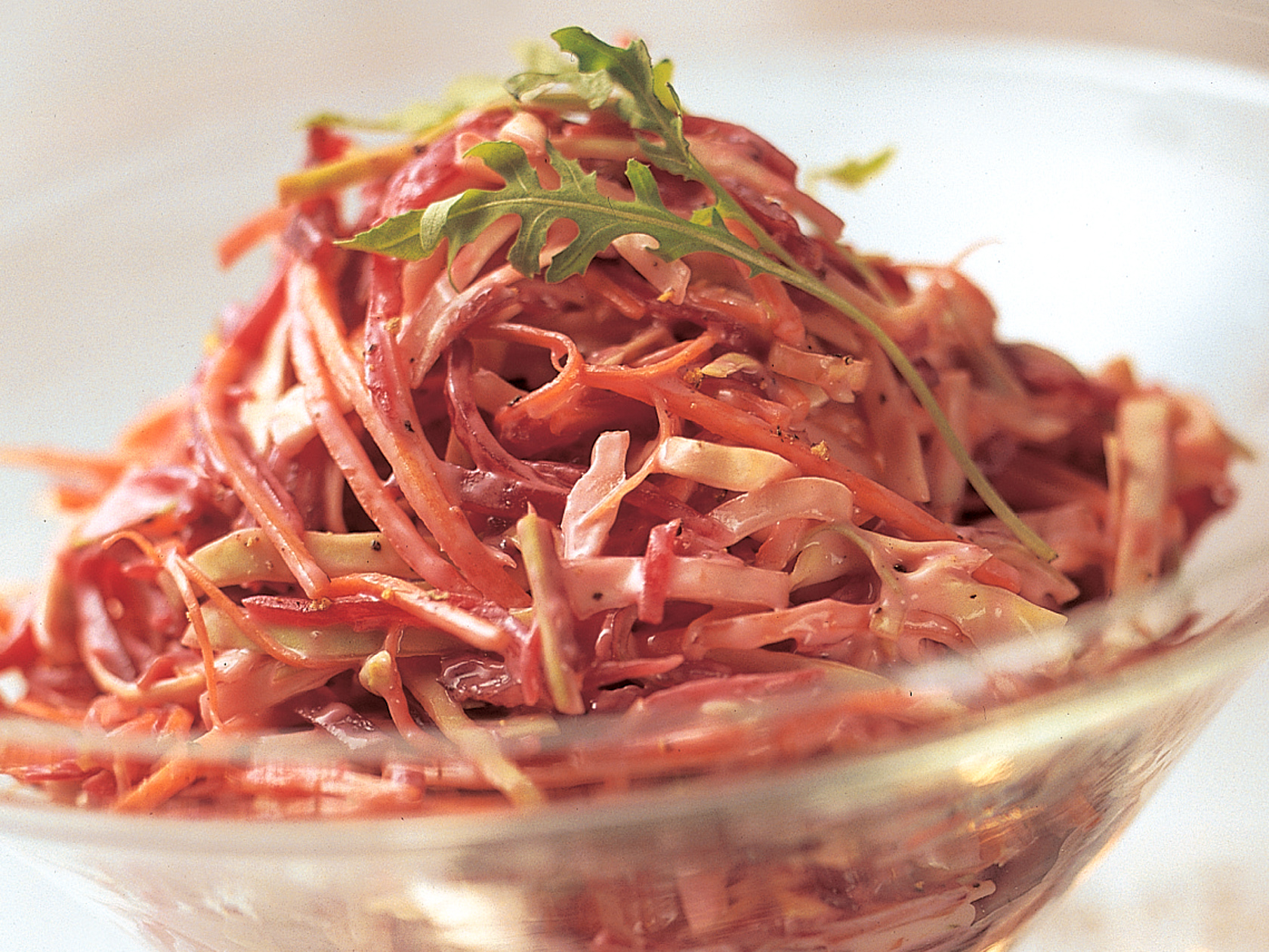 Leikkaa pestyt ja kuoritut punajuuret ja porkkanat monitoimikoneessa tai suikalointikoneella erittäin ohuiksi suikaleiksi. Leikkaa kaali ja purjo samoin. Valmista kastike jogurtista ja majoneesista. Lisää mausteet ja sekoita kastike salaattiaineksiin. Tarkista maku ja anna maustua kylmässä muutama tunti.