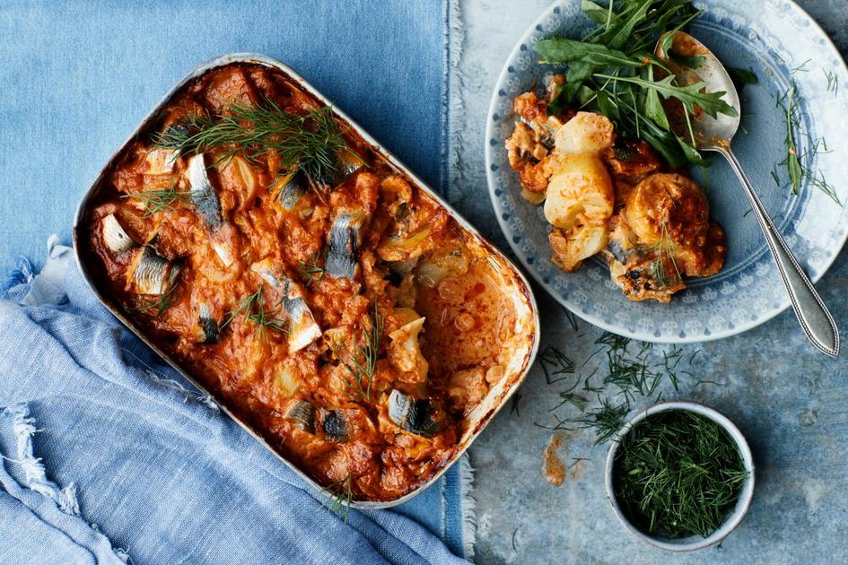 Maukas silakkalaatikko saa päälleen punaisesta pestosta, kermasta ja mausteista tehdyn punaisen hunnun.
