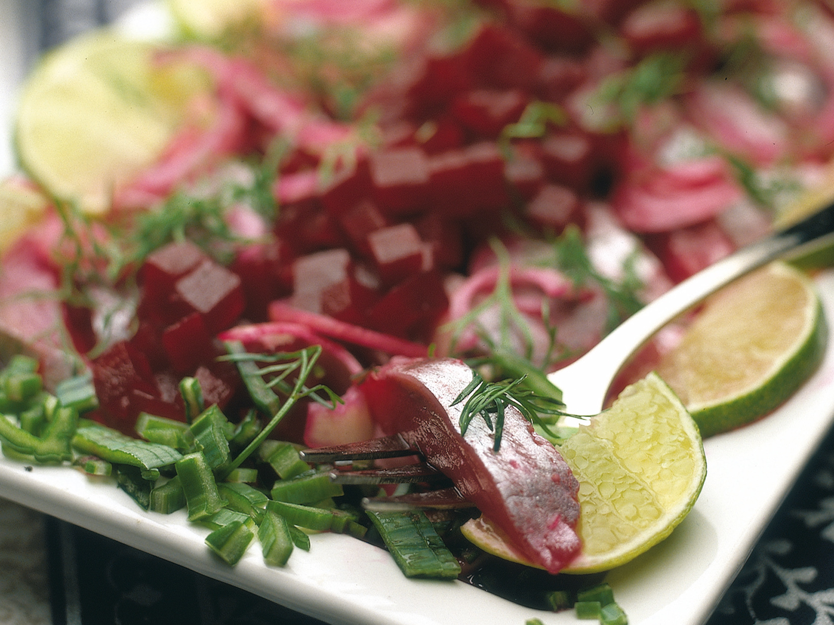Huuhtele sillifileet huolellisesti kylmällä vedellä ja kuivaa ne talouspaperiin. Leikkaa sillistä sopivia suupaloja. Kuori salottisipuli ja valkosipulinkynsi ja leikkaa ne renkaiksi. Sekoita punajuuriliemi, limetin mehu ja hunaja keskenään. Kaada liemi sipuli- ja valkosipulirenkaiden ja sillipalojen päälle. Anna maustua kylmässä hetki. Asettele tarjoiluvadille limittäin sillifileitä, sipuli- ja valkosipulirenkaita ja punajuurikuutioita. Kaada liemi päälle. Koristele tuoreella tillillä ja limetin lohkoilla.