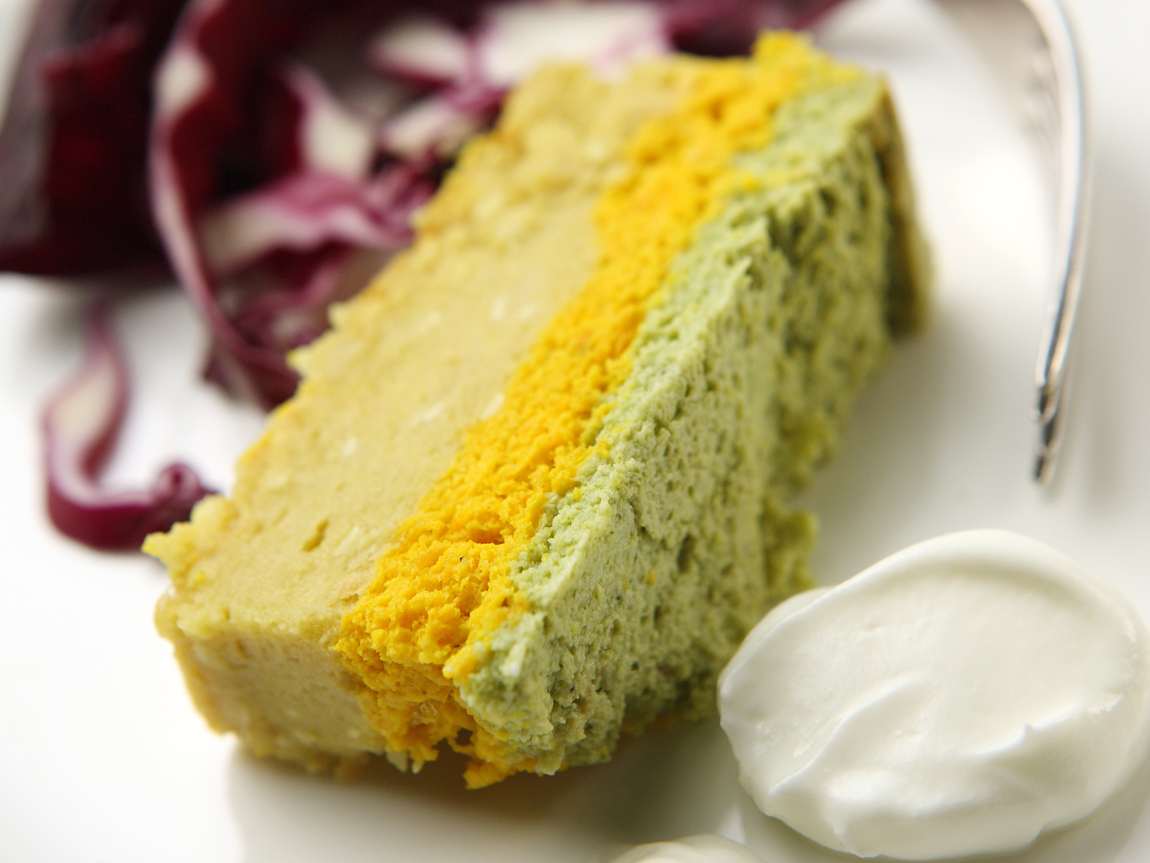 Kuori ja paloittele porkkanat. Keitä pehmeiksi kevyesti suolatussa vedessä. Valuta porkkanat ja hienonna yleiskoneessa. Kuori ja murskaa joukkoon valkosipulinkynnet. Mausta. Erottele keltuaiset valkuaisista ja lisää keltuaiset ja ranskankerma seokseen. Vatkaa valkuaiset kevyeksi vaahdoksi ja kääntele joukkoon. Kaada porkkanasose vuokaan kikhernesoseen päälle.