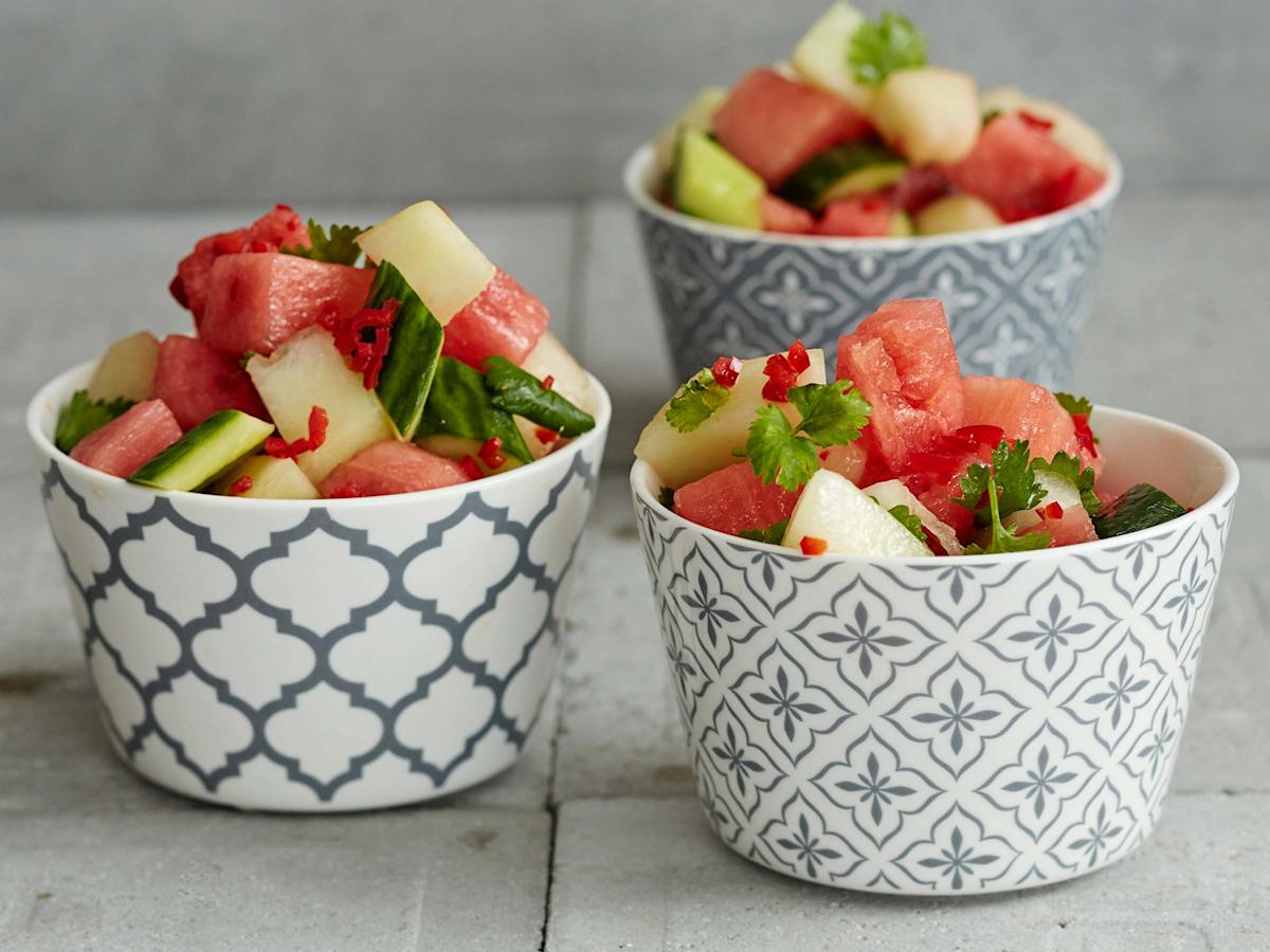 Viileässä maustunut melonisalaatti on kevyt lisäke kaikille grilliruoille.