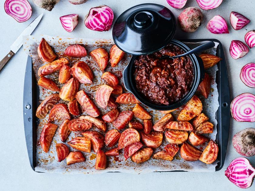 Raitajuurilohkot paahtuvat uunissa makoisiksi suupaloiksi. Kauniin raidallisten juuresten vierellä hautuu helppo ja herkullinen jauhelihakastike.