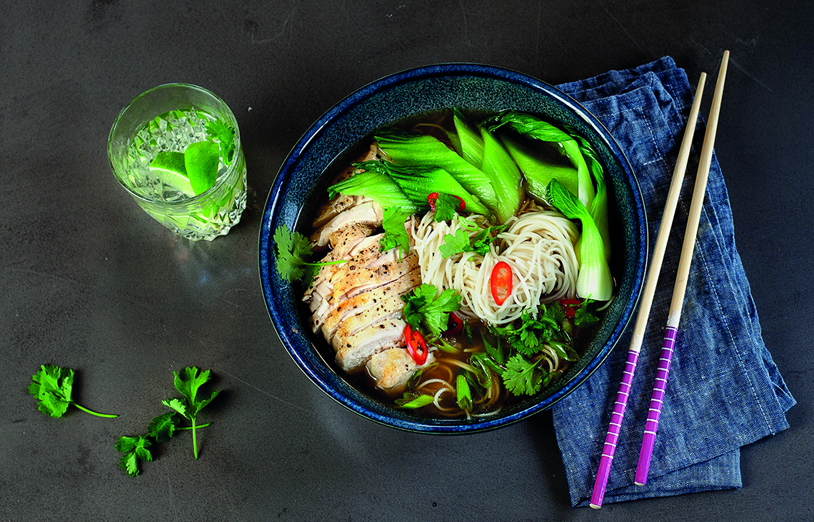Jaa nuudelit ja suikaloidut broilerinfileet neljälle lautaselle. Jaa kanaliemi pak choin kanssa jokaiselle lautaselle.
