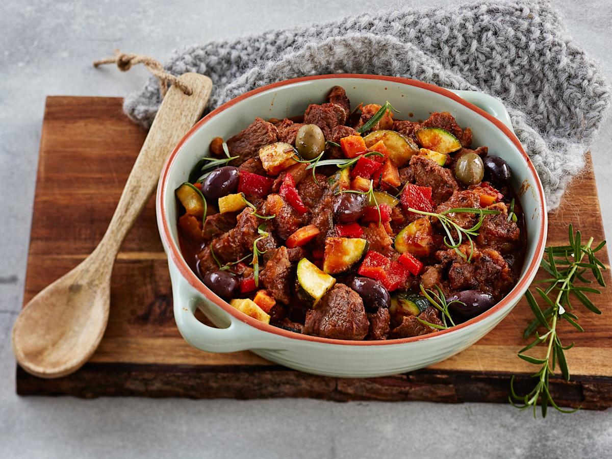 Huuhtele ja viipaloi kesäkurpitsa ja kuutioi paprikaa. Valuta oliivit liemestään. Lisää kasvikset pataan ja kypsennä pataa vielä puolisen tuntia.