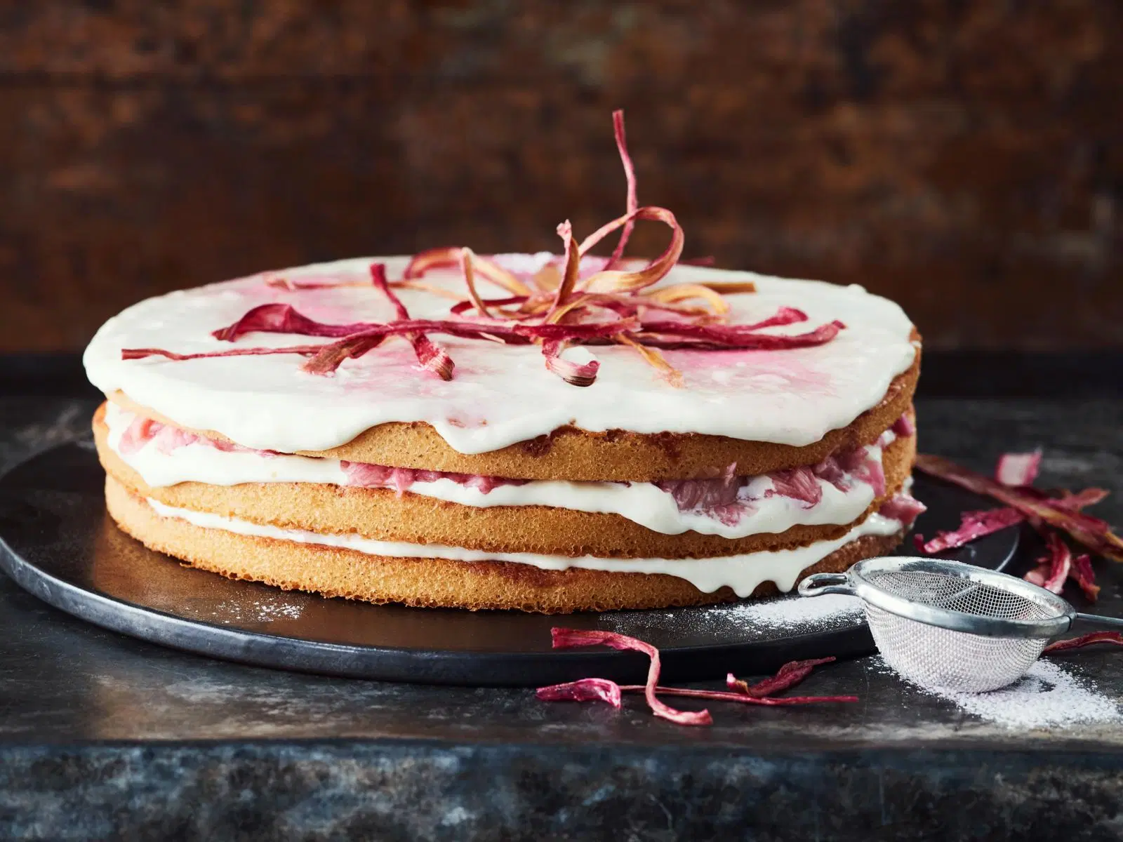 Huom! Jos koristelet kakun sokeroidulla raparperilla, voit valmistaa sen esimerkiksi edellisenä päivänä. Sokeroidut ja kuivatut raparperit säilyvät kannellisessa tölkissä noin viikon.