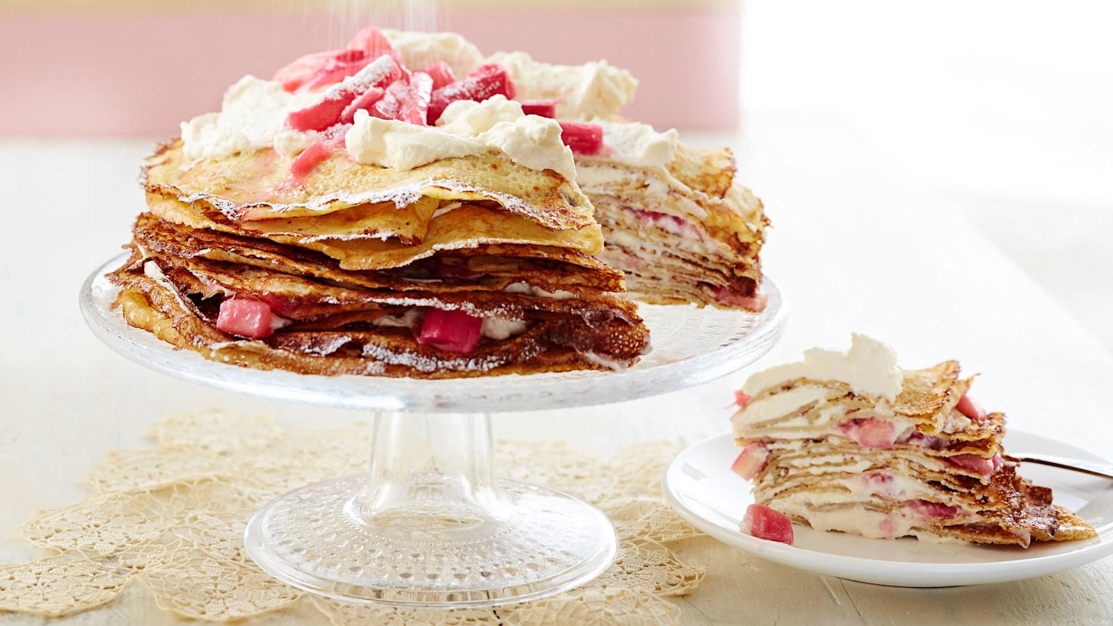 Letuista koottu kakku on kesän hauskin ja rennoin jälkiruoka. Tämä herkullinen lettukakku saa täytteekseen raparperia, sitruunatahnaa ja mascarpone-kermavaahtoa.