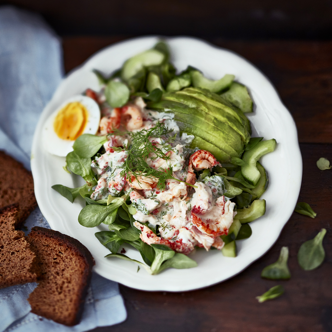 Jaa salaatti neljälle lautaselle. Lusikoi ravunpyrstökastiketta päälle ja koristele halkaistulla kananmunalla. Tarjoile saaristolaisleivän kanssa.