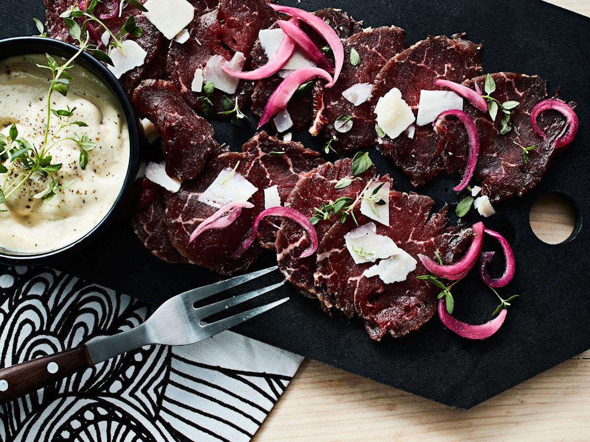 Leikkaa kohmeinen liha erittäin ohuiksi viipaleiksi ja levitä viipaleet tarjoiluvadille. Koristele timjamilla, parmesaanilastuilla ja halutessasi savusipulihillokkeella. Tarjoa kastikkeen kanssa.