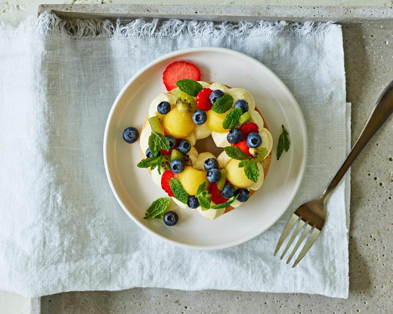Vaniljaisella tuorejuustolla, tuoreilla hedelmillä ja raikkaalla mintulla täytetty rinkeli on aamiaisen tai brunssin juhlava kruunu.