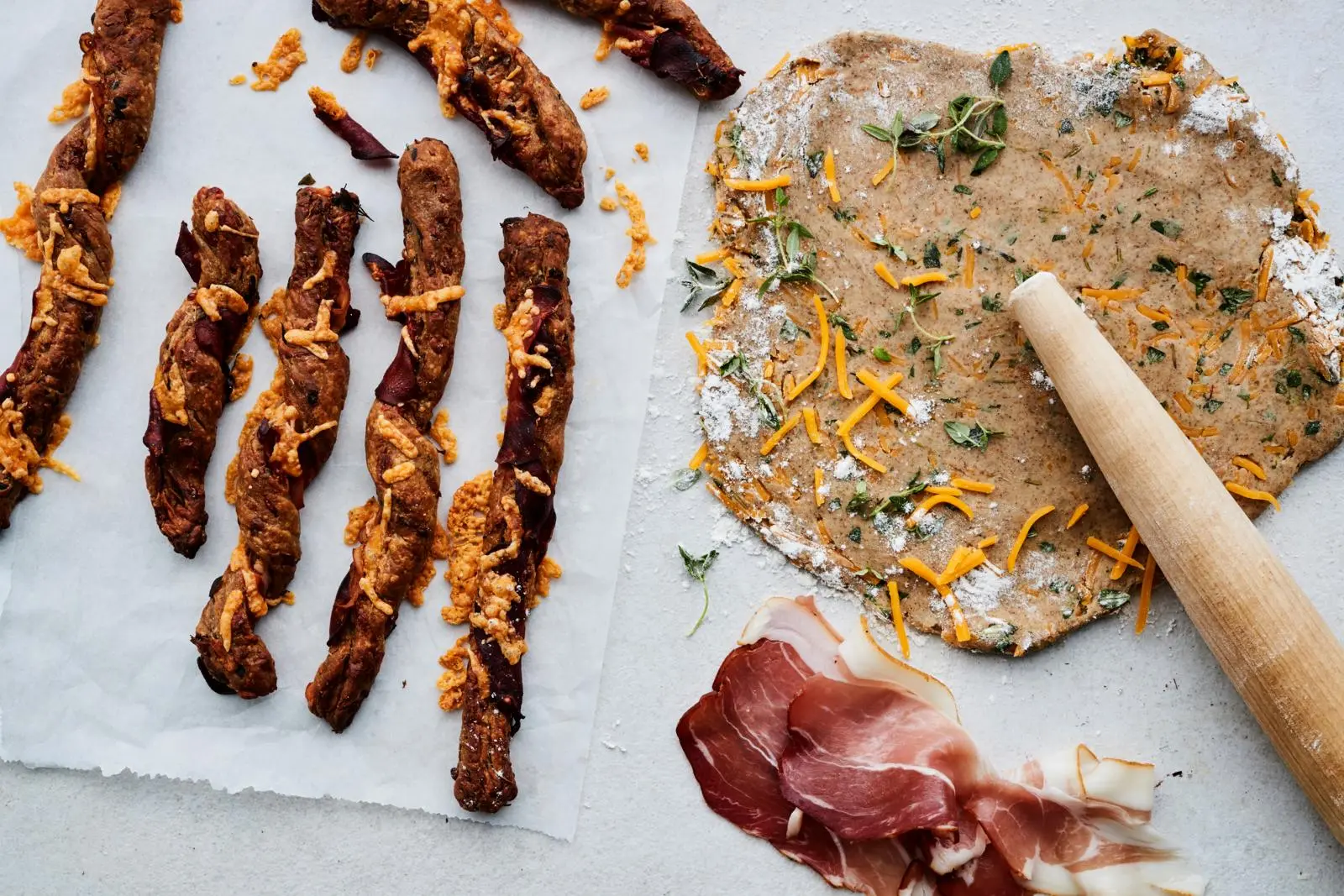 Leivo helppoja suolaisia napostelutikkuja valmiista ruis-perunataikinasta. Kinkulla, juustolla ja timjamilla maustetut tikut sopivat suolaiseksi pikkuherkuksi.