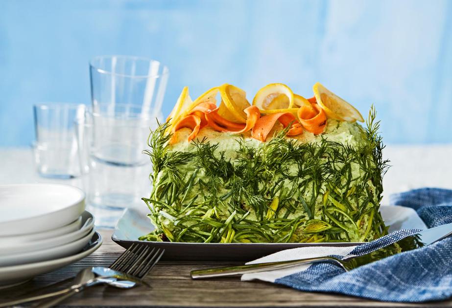 Kasvisvoileipäkakun perustana toimii saaristolaisleipä, jota täydentää maukas nyhtökauratäyte. Kuorruta kakku näyttäväksi vaaleanvihreällä herne-piparjuuritahnalla.