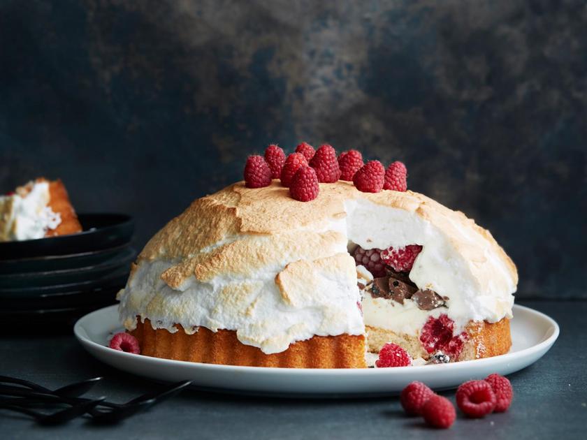Paahda torttua uunissa 3–5 minuuttia, kunnes marengin pinta ruskistuu hiukan. Koristele vadelmilla ja tarjoa heti.