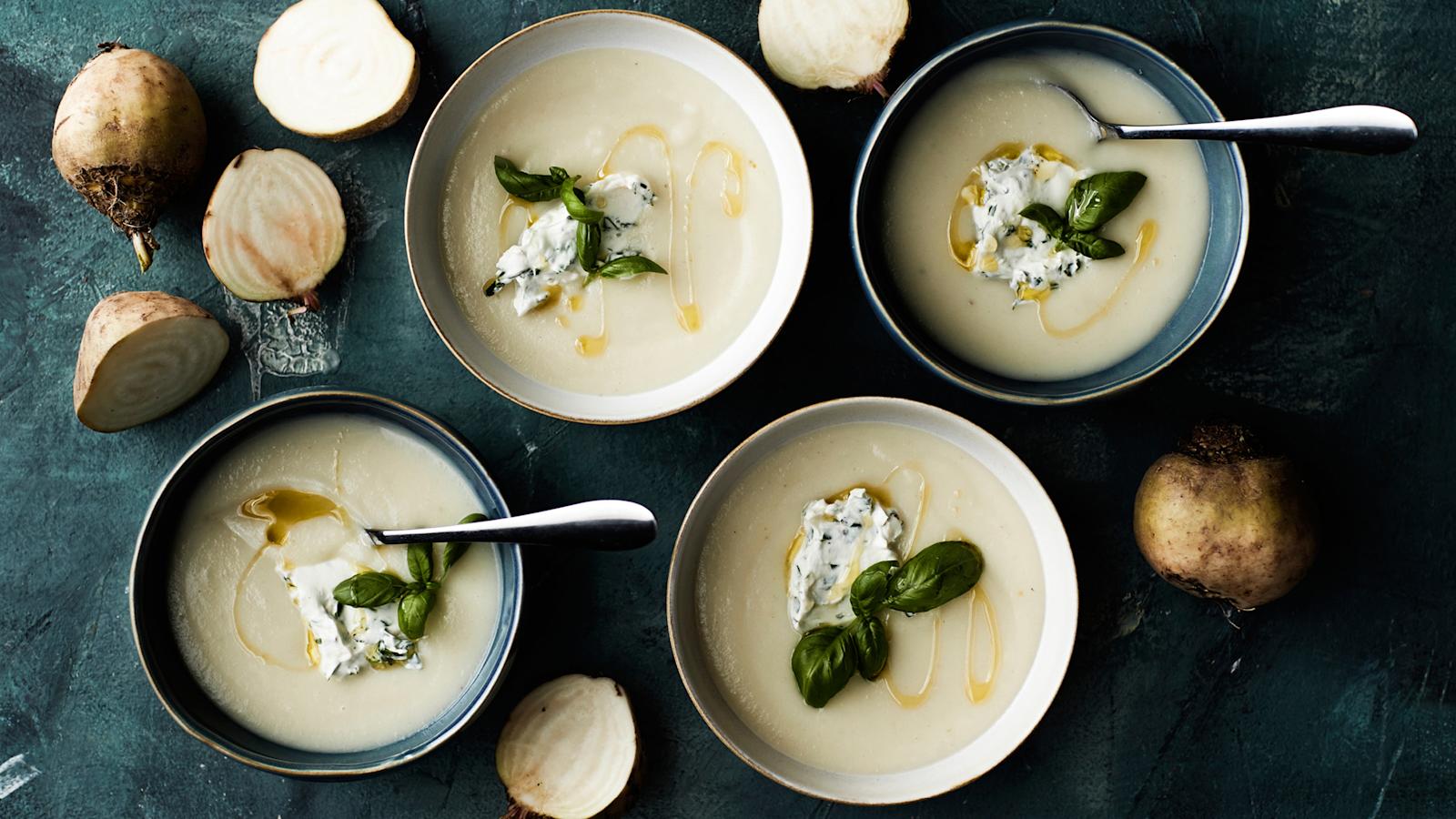 Tee sosekeitto vaihteeksi lempeän makeasta valkojuuresta. Viimeistele lisäämällä pinnalle nokare basilikalla maustettua tuorejuustoa.
