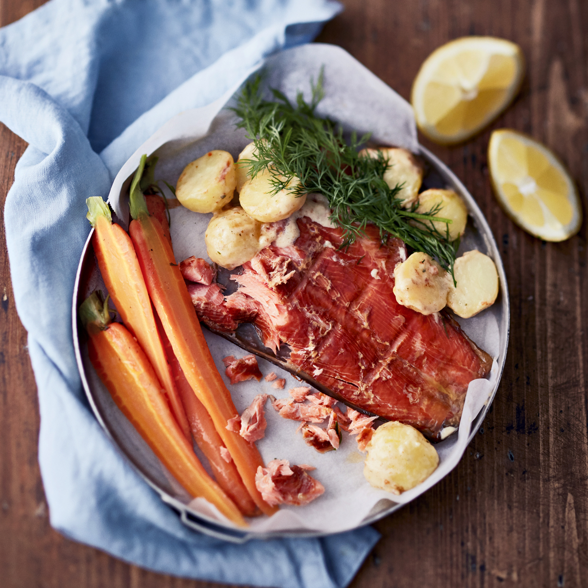 Tarjoile savukala porkkanoiden ja tillimuhennetun perunan kanssa.