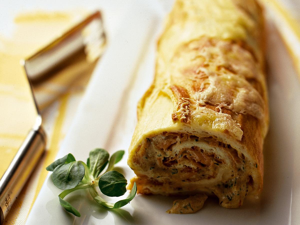 Laita munakasrullan täytteeksi tuorejuustoa, pestoa ja lohta. Kuorruta arkiruokien herkku juustoraasteella.