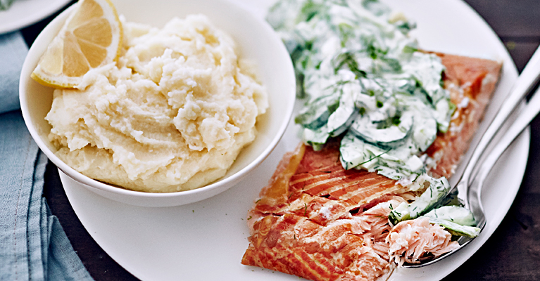 Tarjoile lämmitetyn perunamuusin ja lohen kanssa.