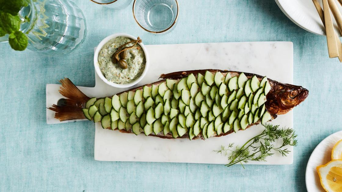 Nosta siika tarjoiluastialle ja poista yläpuolen nahka. Leikkaa kurkku poikittain kahteen osaan. Leikkaa toinen kurkkupala pitkittäin neljään osaa ja viipaloi ohuiksi. Nosta viipaleita kalan päälle pyrstöstä alkaen siten, että kalan pintaan muodostuu suomukuvio.