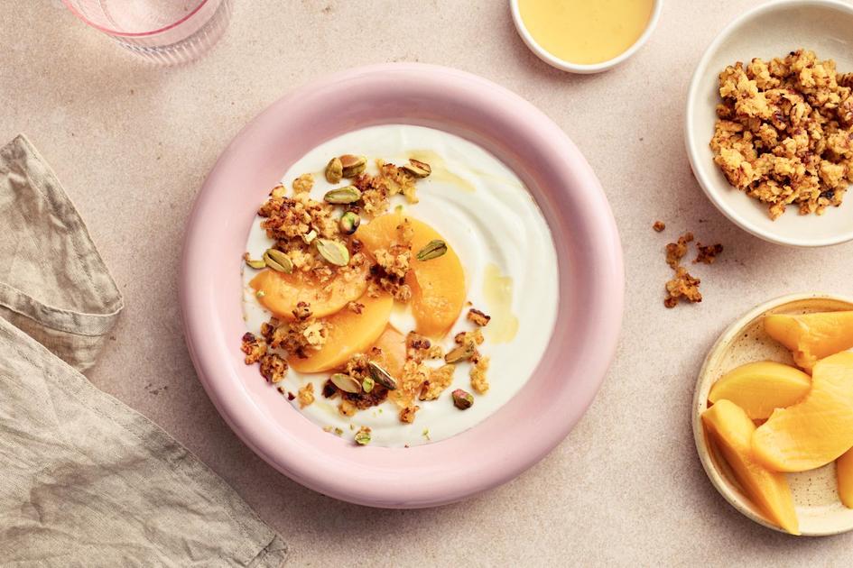 Tarjoile muru jogurtin, pähkinöiden, hunajan ja persikkalohkojen kanssa.