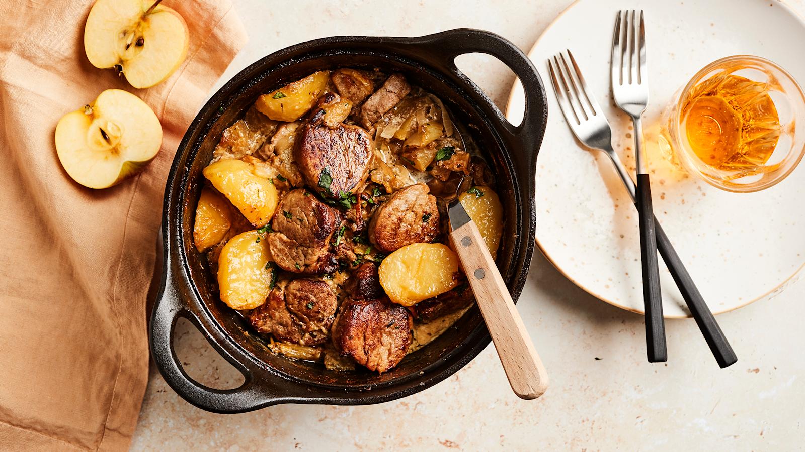 Ihana kiireettömän sunnuntain lihatapa valmistuu uunissa mureaksi paahtuvasta porsaan sisäfileestä, talviomenoista ja smetanaisesta siiderikastikkeesta. Lihapata ja perunat valmistuvat samassa padassa uunissa lähes itsekseen.