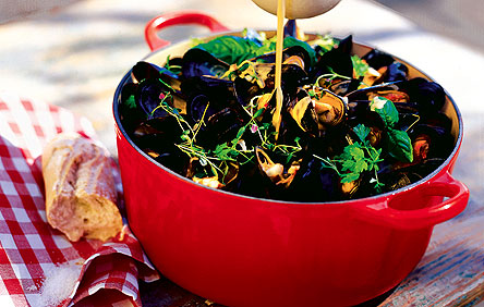 Lisää liemeen tomaatit, timjami ja kerma. Kiehauta seosta reippaasti muutama minuutti, ja kaada seos simpukoiden päälle. Tarjoile tuoreen maalaisleivän ja raikkaan, viileän viinin kanssa.
