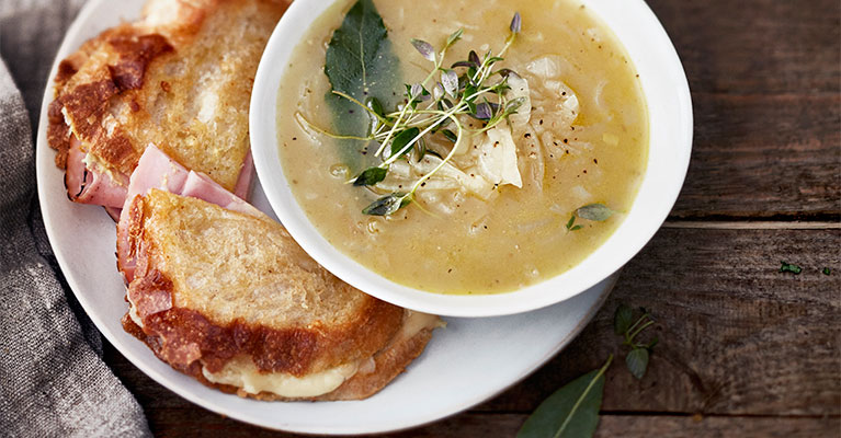 Lisää kuuma lihaliemi sipulien joukkoon, vähän kerrallaan. Sekoita huolellisesti, jotta jauhot eivät paakkuunnu.