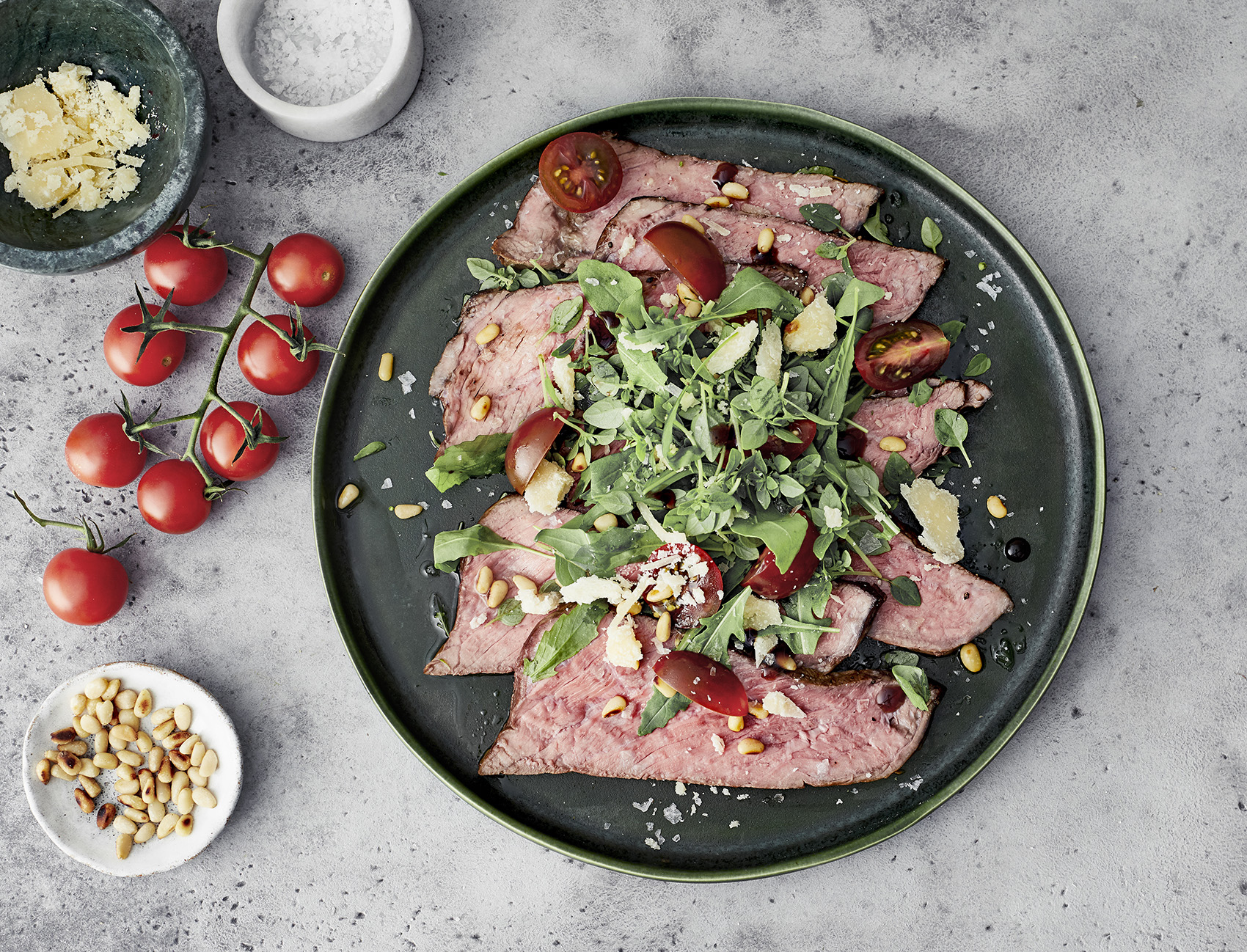 Huuhtaise ja kuivaa rucola. Laita lihan päälle. Valuta salaatille ja lihalle öljyä ja balsamicoa. Viimeistele sormisuolalla, pippurilla, pinjansiemenillä ja tomaattiviipaleilla.