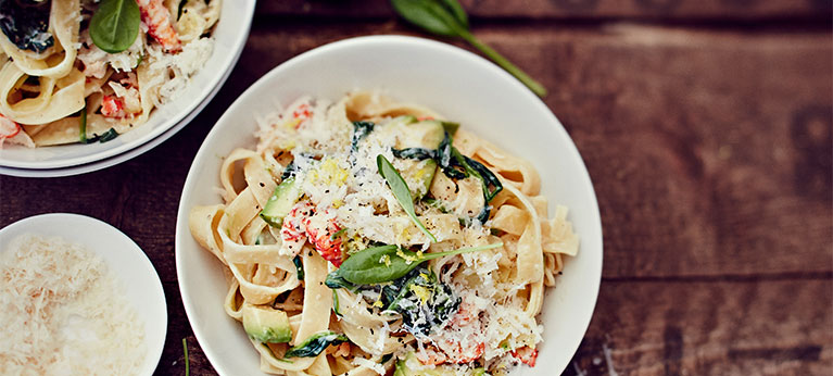 Kuori avokadot, poista niistä kivet ja kuutioi palasiksi. Valuta ravunpyrstöt. Lisää valutetut ravunpyrstöt ja avokadot pastaan.