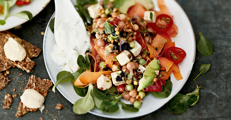 Tarjoile hummuksen, tsatsikin ja siemennäkkileivän kanssa.