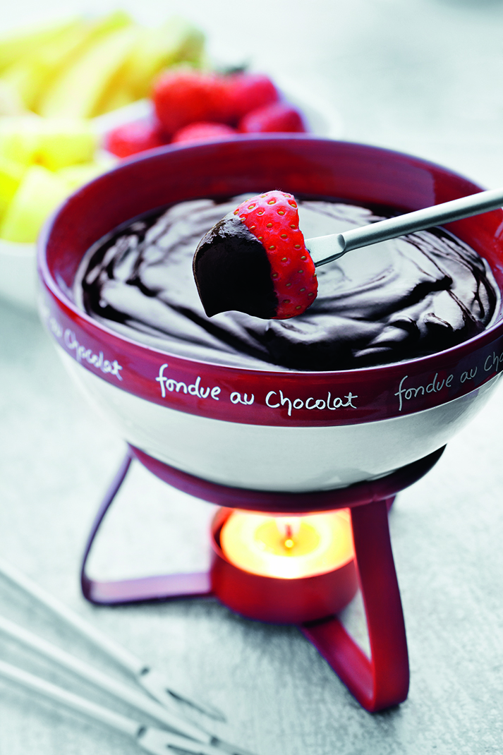 Dippaa hedelmänpala lämpimään suklaafondueen, käytä fonduehaarukkaa.