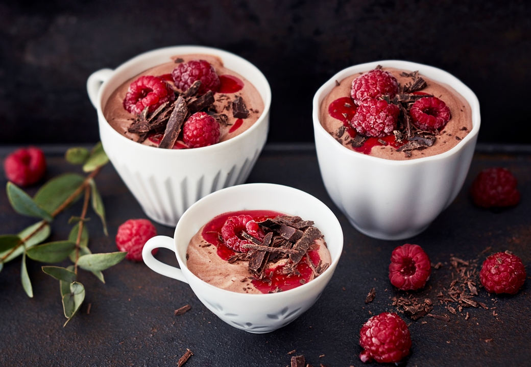 Vuole lopusta suklaasta lastuja esimerkiksi kuorimaveitsellä. Tarjoa suklaavaahto tuoreiden vadelmien, melban ja suklaarouheen kera.