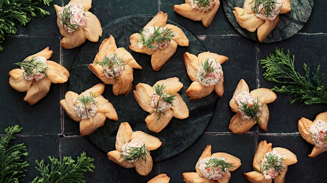 Joulutortut täytetään suolaiseksi herkuksi kylmäsavulohella, tuorejuustolla, tillillä ja piparjuurella. Tarjoa helppoja lohitorttuja pikkujoulujuhlissa.
