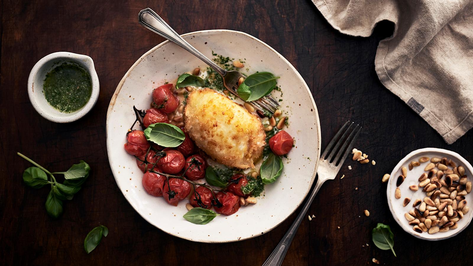 Caprese eli italialainen tomaatti-mozzarellasalaatti tunnetaan raikkaana kesäisenä lisukesalaattina. Tee talvinen caprese paahtamalla tomaatit uunissa meheviksi ja paistamalla leivitetyt mozzarellat öljyssä rapeiksi. Tarjoa alkuruokana, kun juusto on vielä lämmintä.