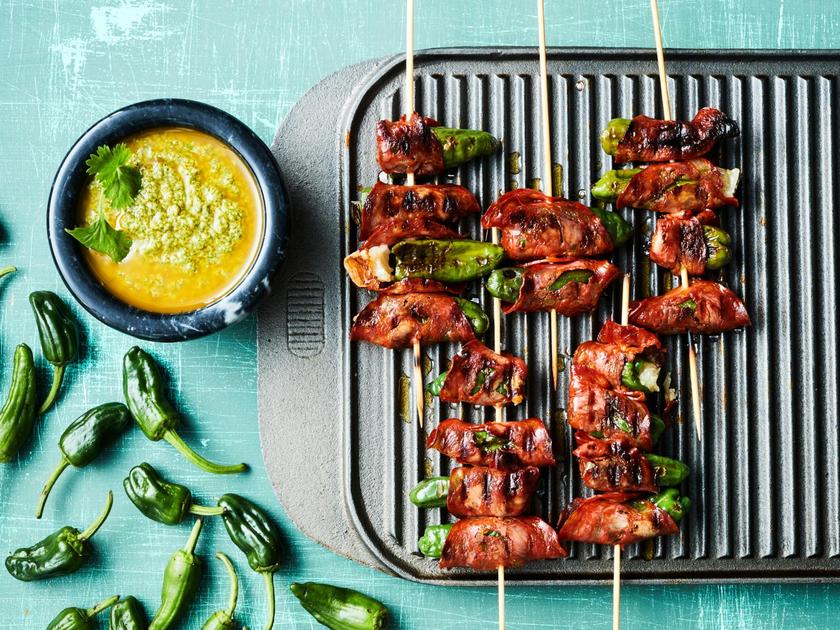 Padron-paprikat täytetään manchegolla, kääritään chorizoon ja tikutetaan grillivartaisiin. Kokeile mojo verde -kastiketta myös muiden grilliherkkujen kanssa.