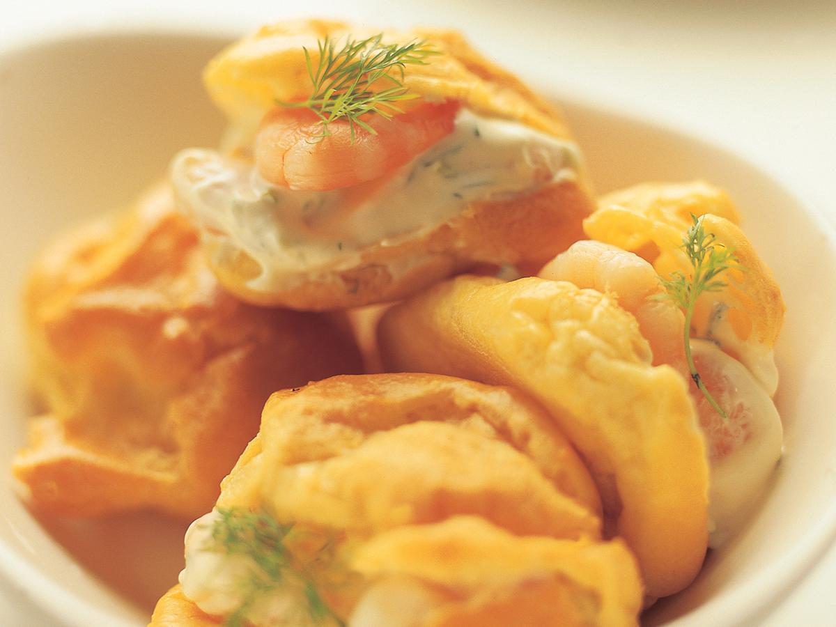 Kuumenna rasva ja vesi. Lisää vehnäjauhot ja kuumenna seosta kokoajan sekoittaen kunnes se irtoaa hyvin kattilan pohjasta. Nosta kattila liedeltä ja lisää kananmunat jäähtyneeseen seokseen yksitellen voimakkaasti vatkaten. Nostele lusikalla tai pursota taikinanokareita leivinpaperin päälle pellille. Paista uunin keskiosassa 200 asteessa noin 30 minuuttia. Älä avaa uunin luukkua paistamisen aikana. Halkaise jäähtyneet tuulihatut ja täytä eri täyttein. Valmista täytteet sekoittamalla kunkin reseptin aineet keskenään.
