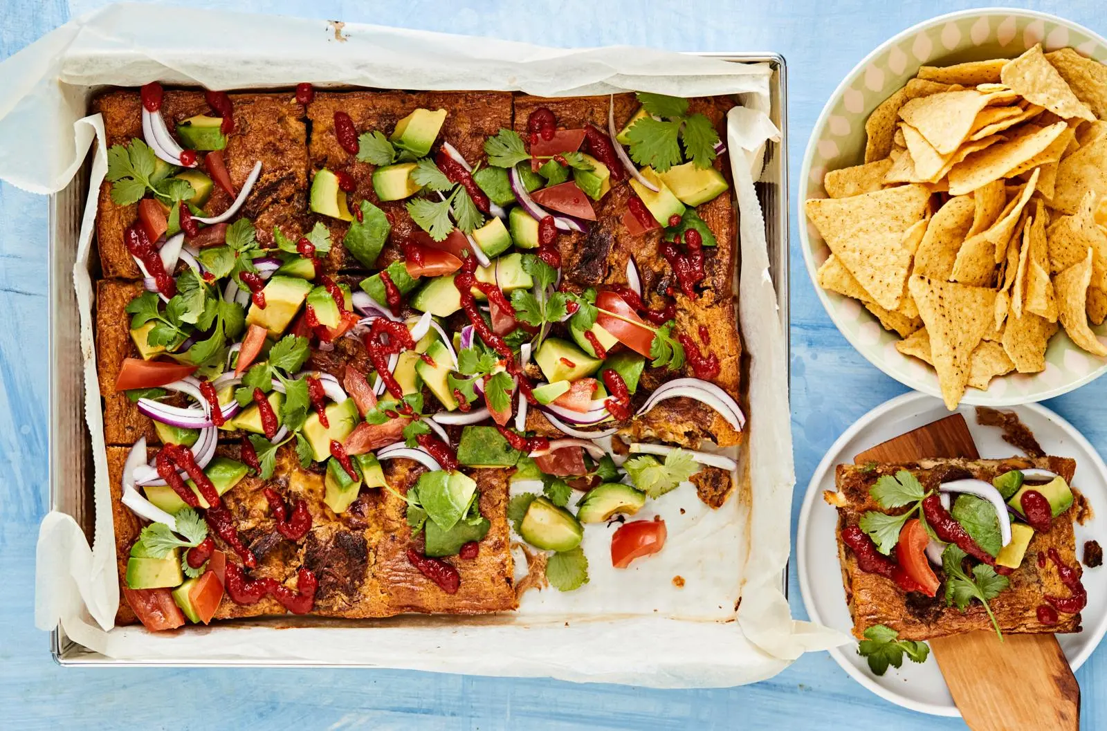 Lisää nyhtökaura, tacomauste ja öljy kananmunamassaan, sekoita ja kaada leivinpaperilla peitetylle uunipellille. Kypsennä uunissa 20–25 minuuttia munakkaan paksuuden mukaan.