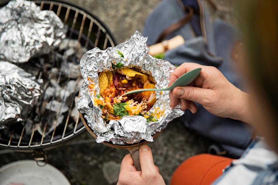 Siirrä nyytit grillistä tai nuotiolta lautaselle ja avaa varovasti. Viimeistele halutessasi tuoreilla yrteillä.