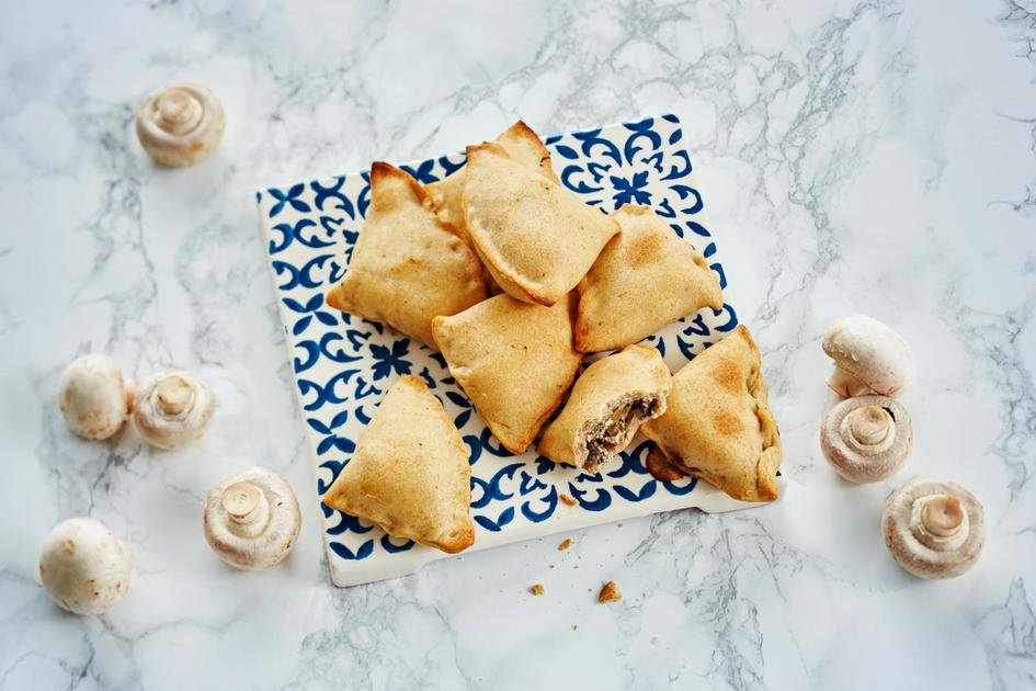 Kasvispasteijat saavat täytteekseen herkkusieniä, sipulia ja oliiveita. Pasteijat saavat texmex-tuulahduksen tacomausteesta ja pehmeyttä tuorejuustosta.