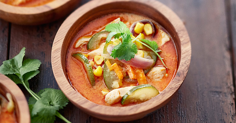 Kuullota sipulit, valkosipulit ja kanan rintafileet tilkassa öljyä. Voit kuullottaa suoraan kattilassa. Lisää currytahna sekä kesäkurpitsat ja porkkanasuikaleet. Anna hautua hetki.