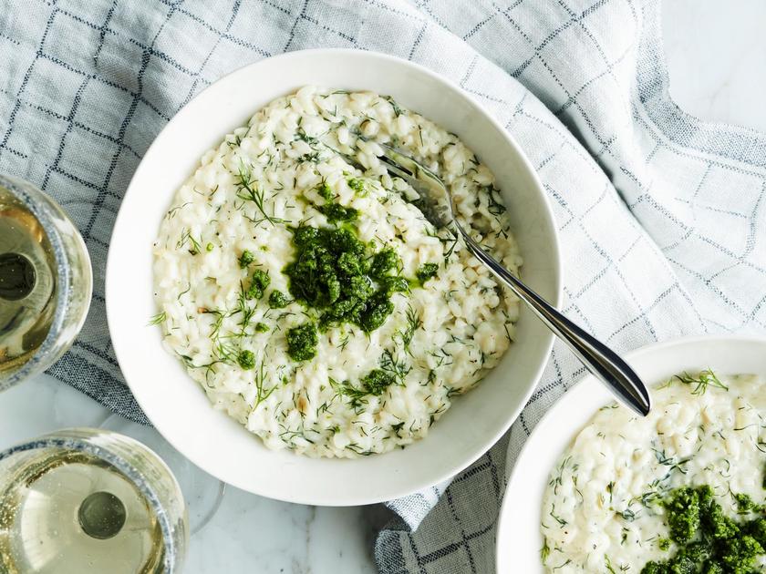 Tarjoa kermaisen pehmeä tillirisotto alkuruokana tai pääruokana. Risotto viimeistellään ihanalla tillistä ja parmesaanista valmistetulla tahnalla.