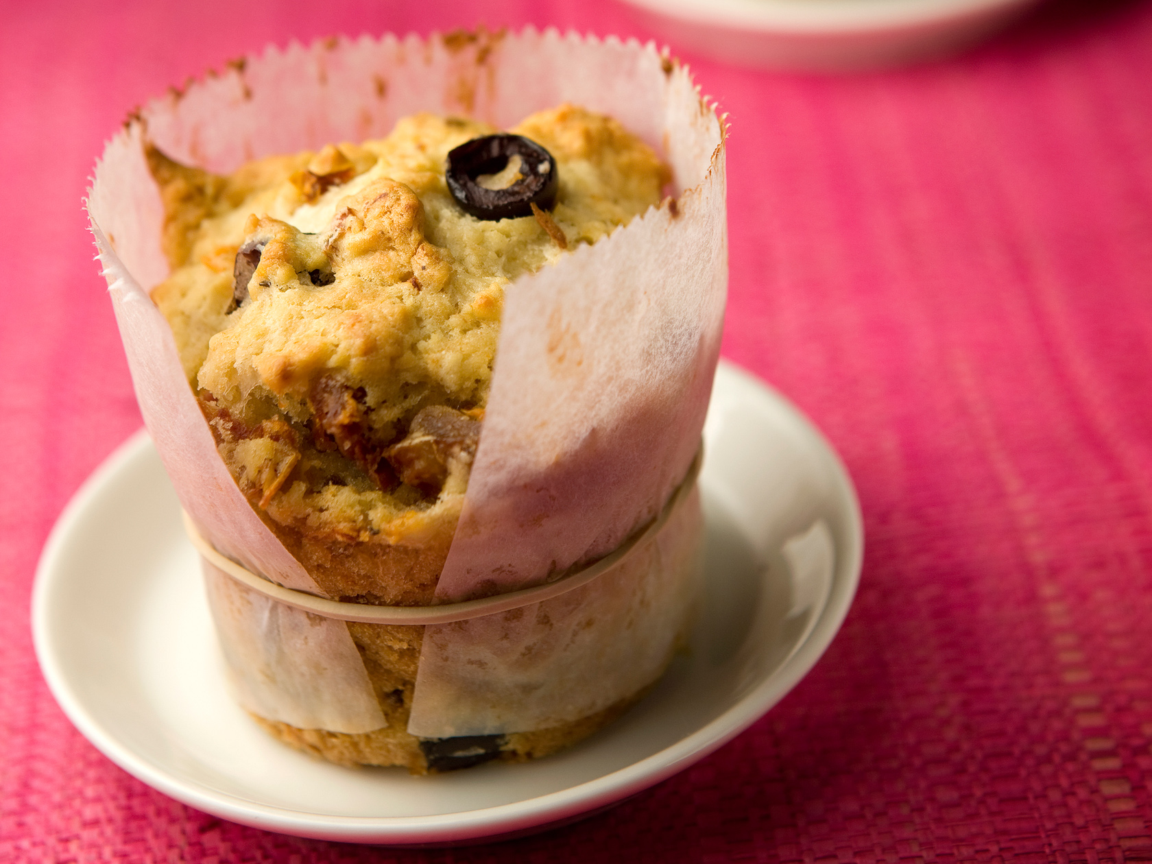 Sekoita kuivat aineet keskenään. Lisää joukkoon kylmä rasva ja nypi murumaiseksi seoksesi. Kaada joukkoon kylmä maito ja sekoita nopeasti tasaiseksi taikinaksi, Pilko aurinkokuivatut tomaatit ja oliivit pieniksi paloiksi ja sekoita taikinaan juustoraasteen kanssa. Nostele taikinasta lusikalla kokkareita ja muovaile ne käsien välissä pieniksi palloiksi. Nosta palat voideltuihin muffinivuokiin. Paista 200-asteisessa uunissa noin 20 minuuttia.
