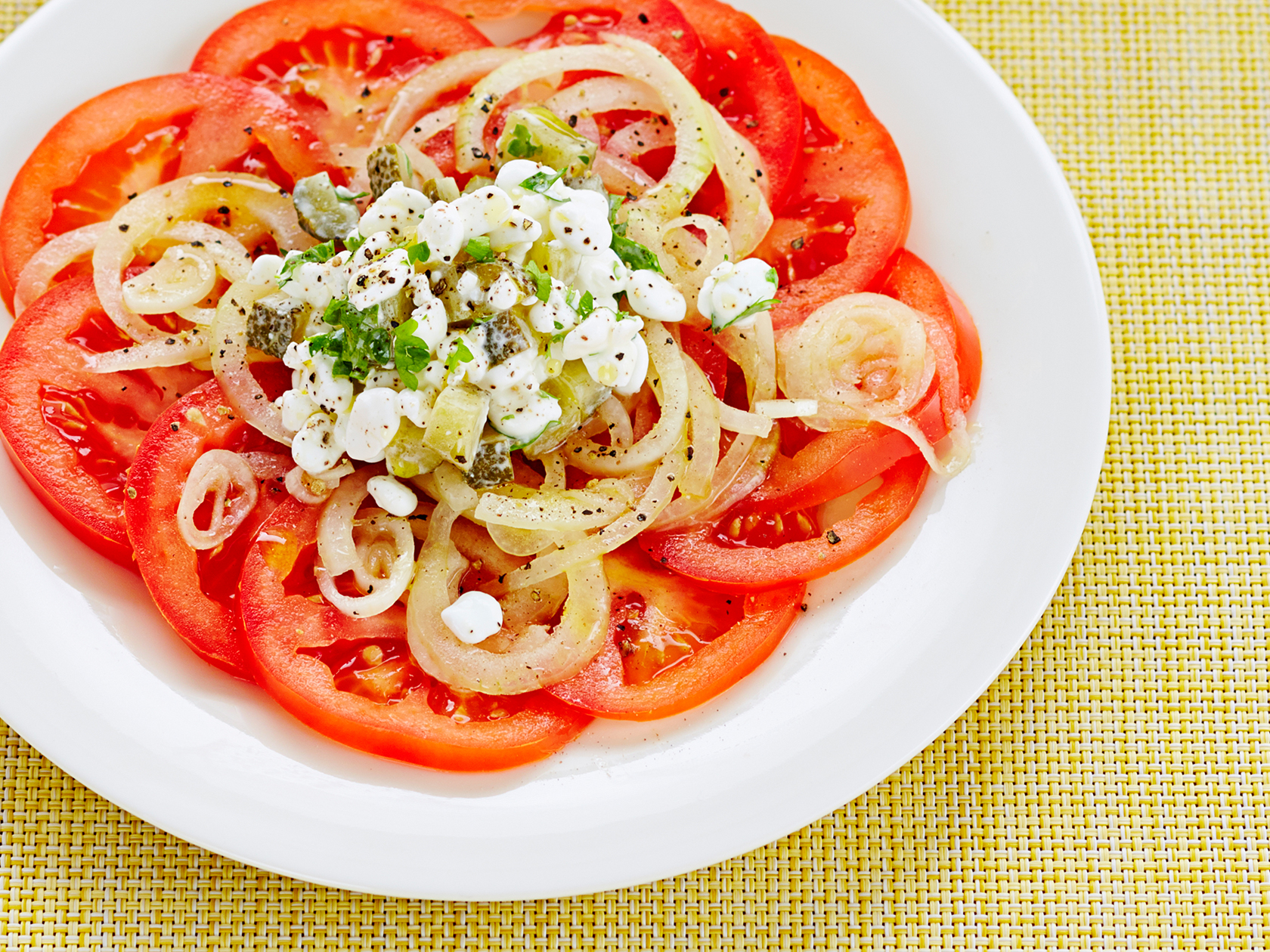 Kuori sipuli ja leikkaa ohuiksi renkaiksi. Nosta viipaleet kulhoon ja valuta päälle öljy, etikka ja mausteet. Sekoita ja anna maustua 5–10 minuuttia. Valmista raejuustosalsa. Hienonna kurkku ja sekoita raejuuston ja hienonnetun persiljan kanssa. Viipaloi tomaatit ja asettele lautaselle. Aseta päälle sipulirenkaat. Nostele päälle raejuustosalsa.