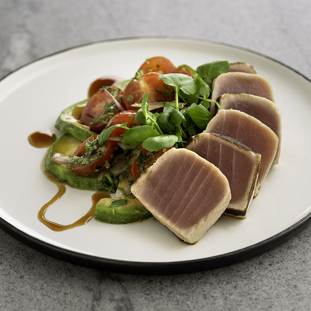 Grillaa tai paahda tosi kuumalla tonnikalatankojen kaikki puolet. Anna jäähtyä ja siivuta ohuiksi siivuiksi.