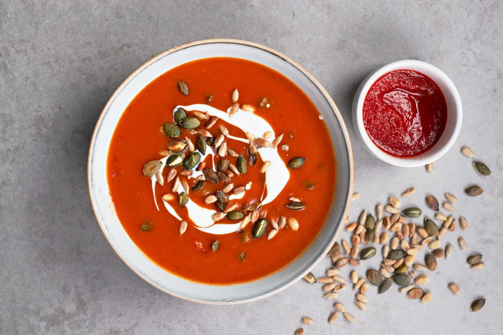 Piristä valmis tomaattikeitto puolikkaalla chilillä ja tilkalla chilikastiketta. Tarjoile lämmittävä keitto maustamattoman jogurtin ja siemenesekoituksen kanssa.