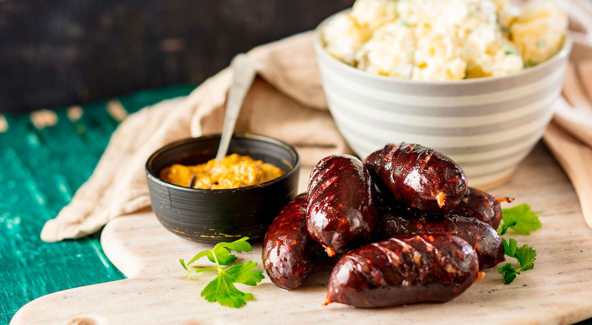 Tarjoile tumma olutsinappi Kulman Keittiön perunasalaatin ja paistetun Riistaryynärin kera.