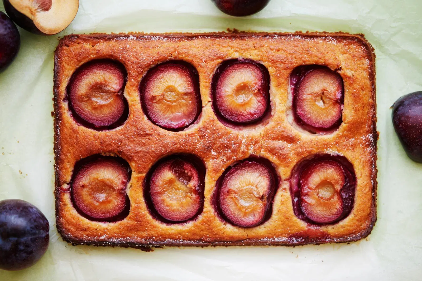 Paina luumut leikkauspinta ylöspäin taikinaan. Kypsennä uunissa 30–35 minuuttia.