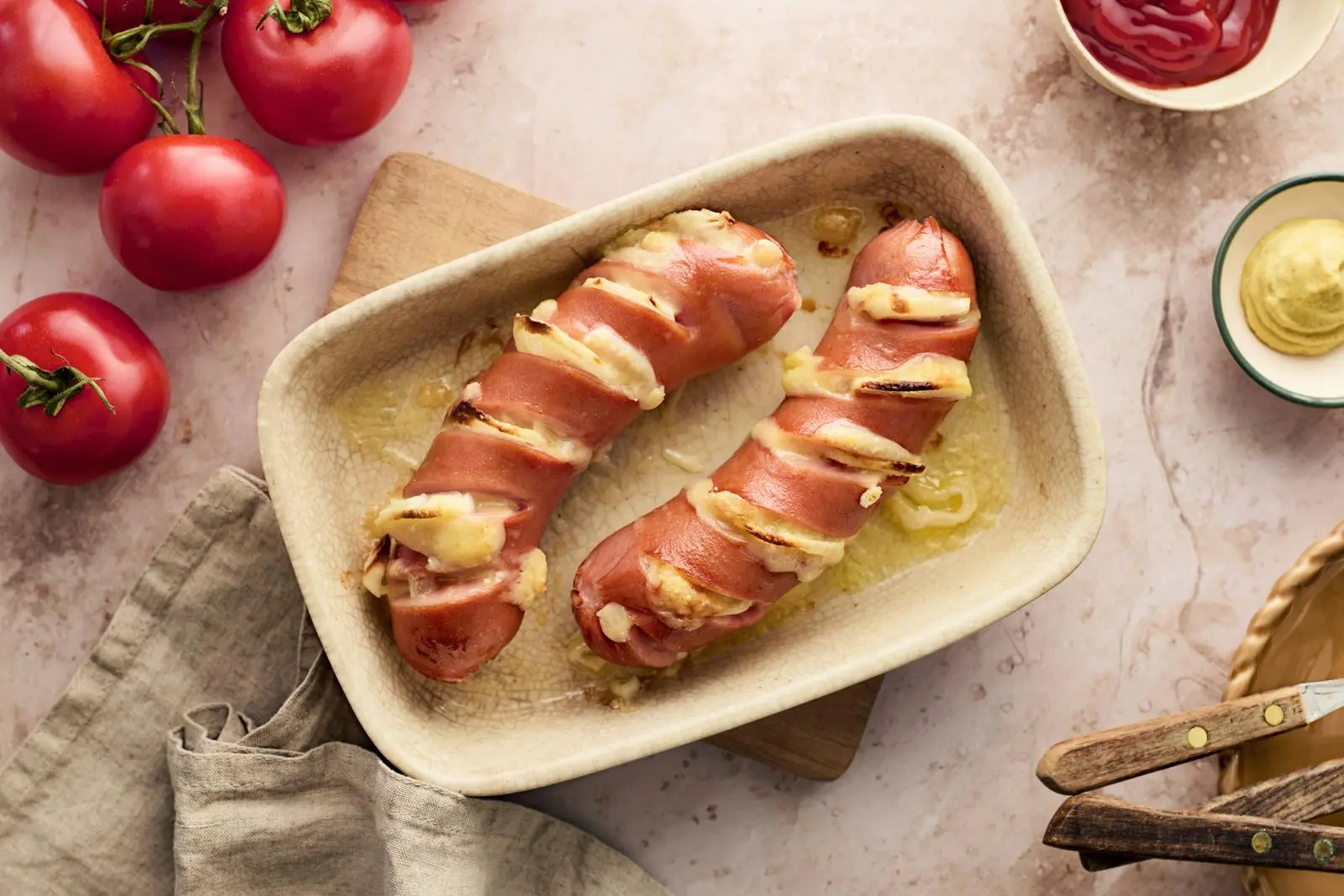 Mehevä uunimakkara täytetään juustolla ja sipulilla. Tarjoile suosikkiruoka esimerkiksi perunamuusin, ketsupin ja sinapin kanssa.