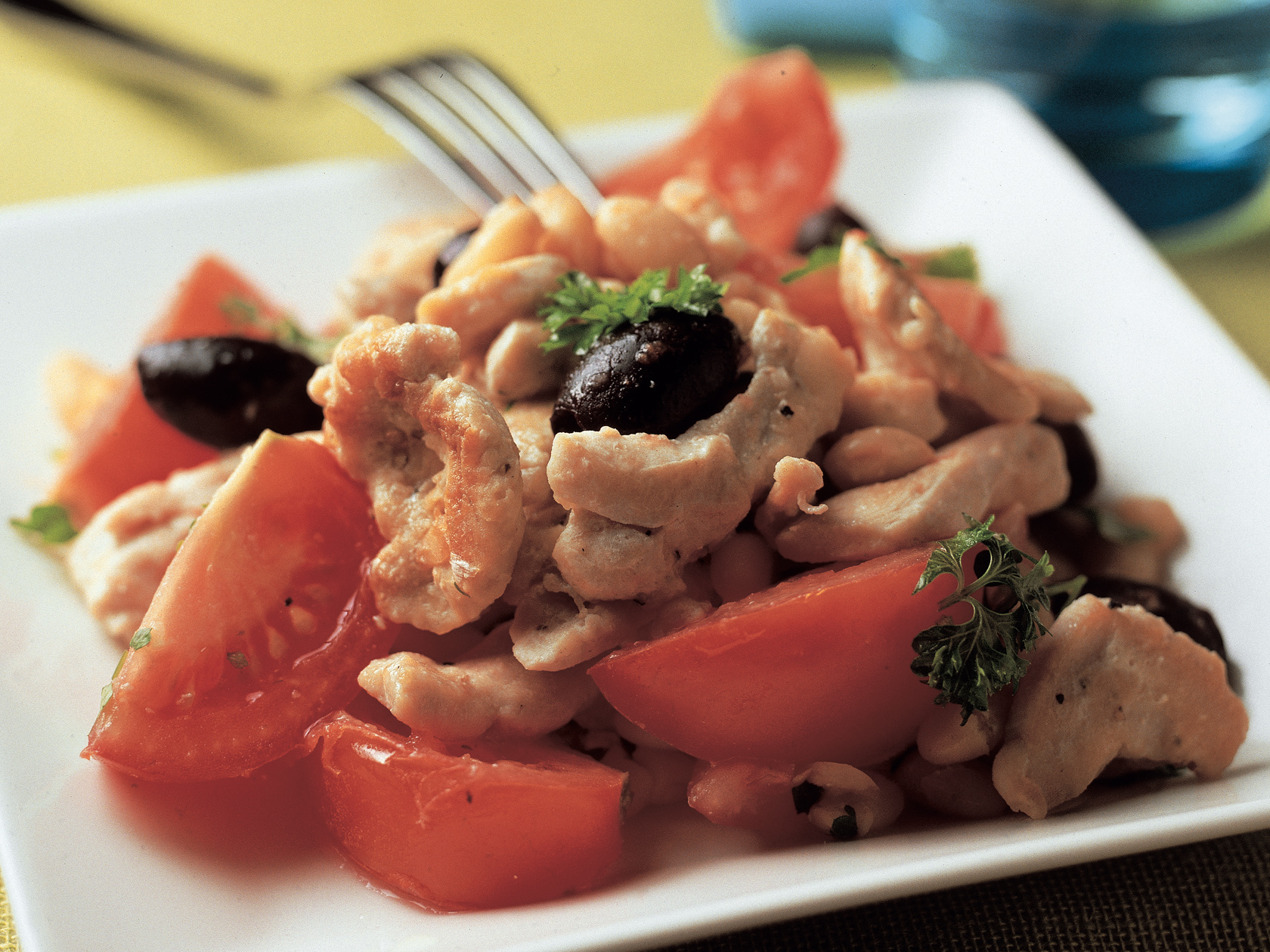 Mausta broilerinsuikaleet suolalla ja mustapippurilla ja paista pannulla öljyssä kauniin ruskeiksi. Lisää hienonnettu valkosipuli ja paista hetki. Lisää vesi ja kikherneet ja hauduta noin 5 minuuttia. Lisää paloitellut tomaatit, oliivit ja sitruunamehu. Kuumenna. Lisää persilja joukkoon juuri ennen tarjoilua. Tarjoile esim. riisin kanssa.