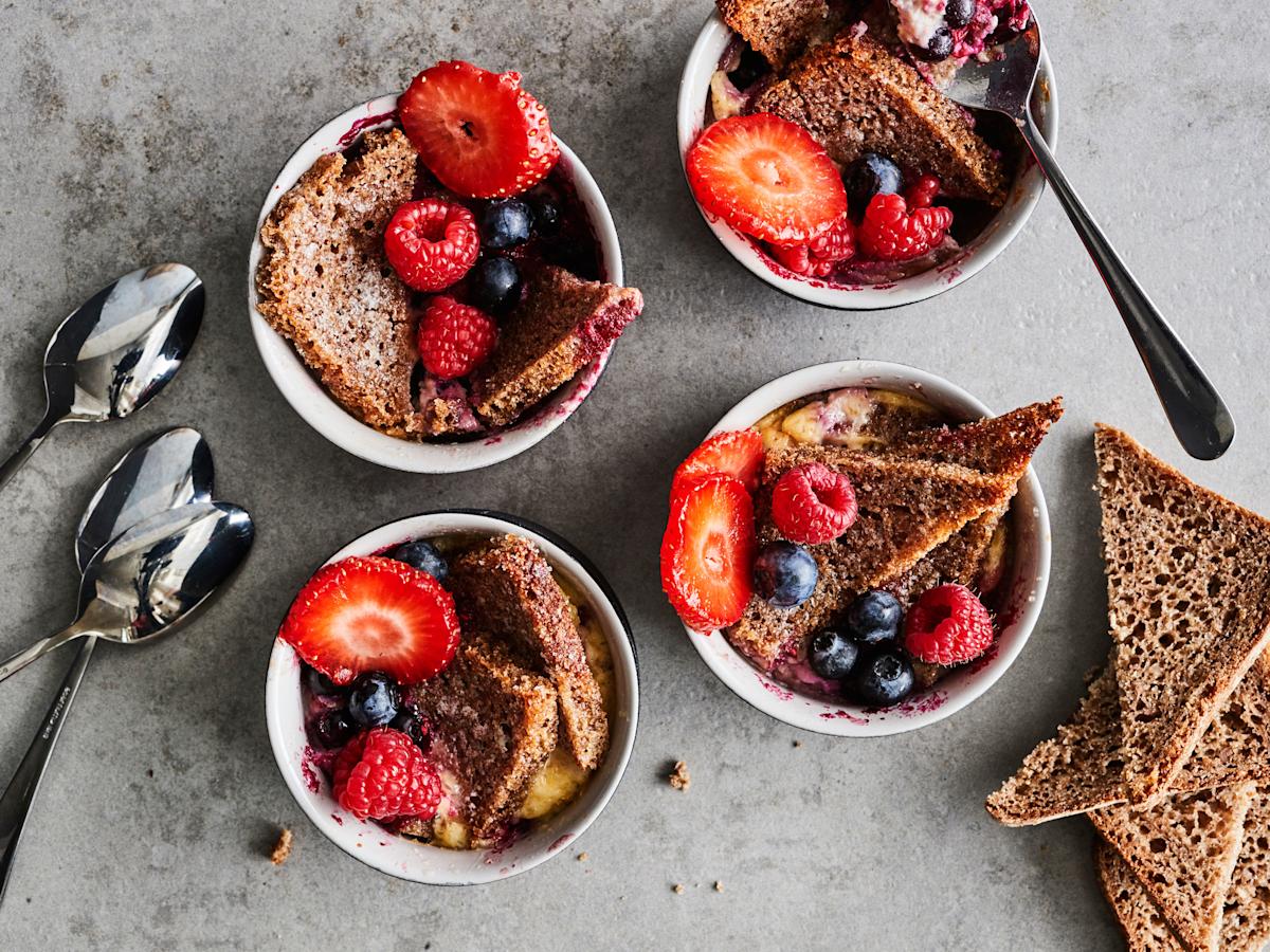 Ruisleivästä ja pakastemarjoista tehty kermainen vanukas on herkullinen jälkiruoka, jonka juuret ovat mummolan keittiössä.
