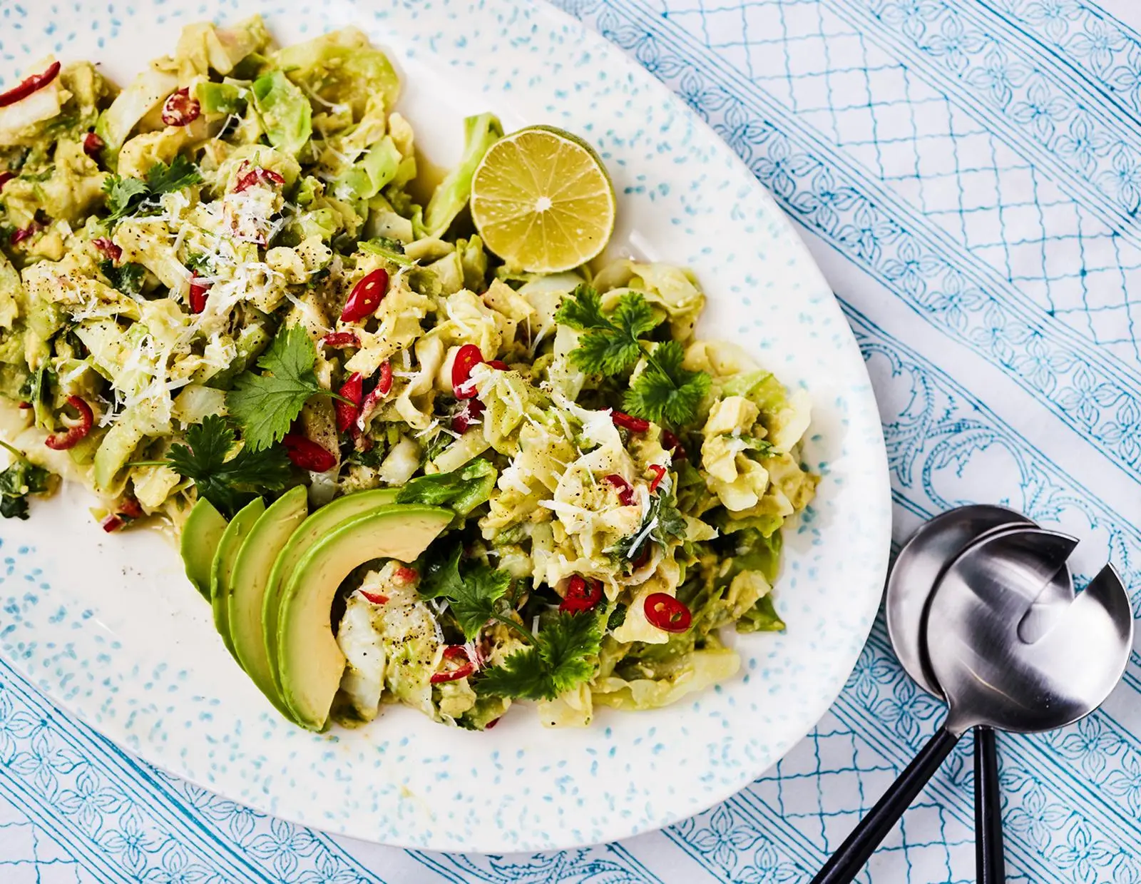 Hienonna korianteri. Raasta parmesaani. Sekoita avokadoseos kaalin joukkoon. Lisää korianteri ja juustoraaste. Mausta suolalla ja pippurilla.