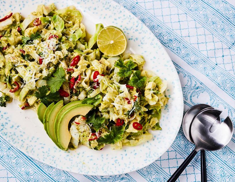 Kun suositun avokadopastan reseptissä vaihtaa spagetin varhaiskaaliin, syntyy nopea ja täyteläinen kasvisruoka, joka on ihanaa sellaisenaan tai lisukkeena.